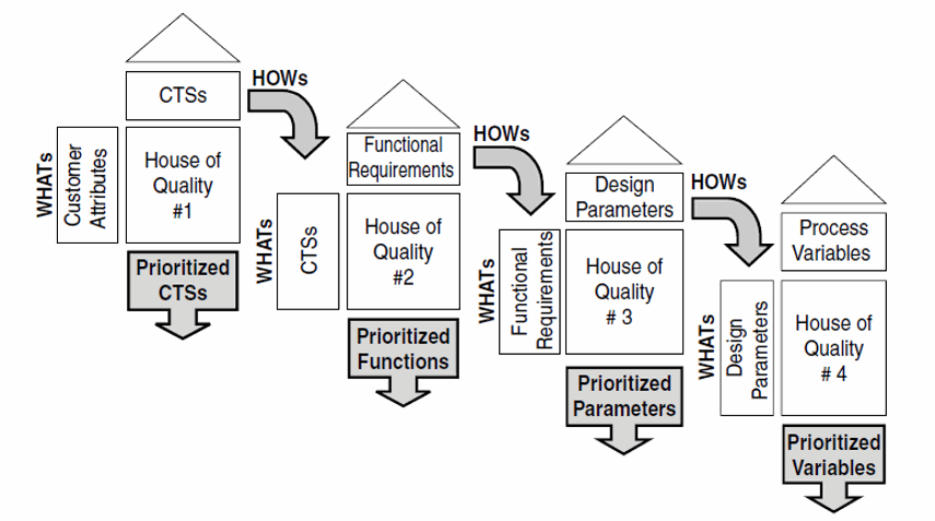 Il primo passo consiste nell’identificare le caratteristiche e/o gli attributi di qualità di un prodotto richiesti dal cliente (Customer Attributes) per poi sviluppare le relative funzioni (Functional Requirements) trasferendole alla progettazione di prodotto (Design Parameters) e di processo (Processo Parameters).